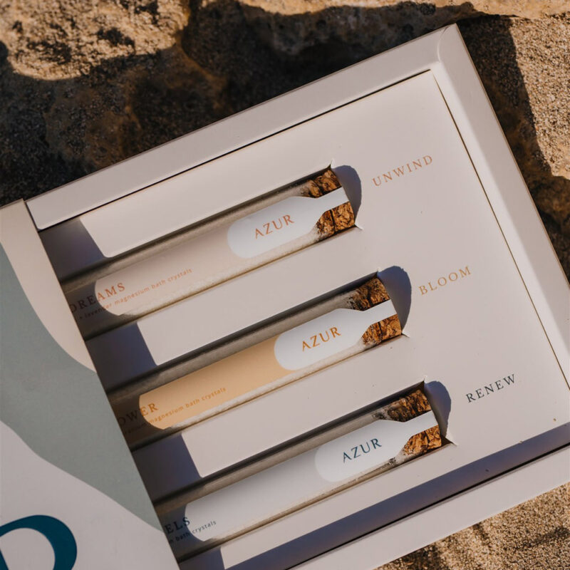 De Bathtime Stories gift set bevat drie luxueuze badzouten in elegante glazen buisjes. Elk blend is zorgvuldig samengesteld met koudgeperste amandelolie, puur magnesiumzout en 100% natuurlijke essentiële oliën – voor een heerlijk ontspannend moment thuis.